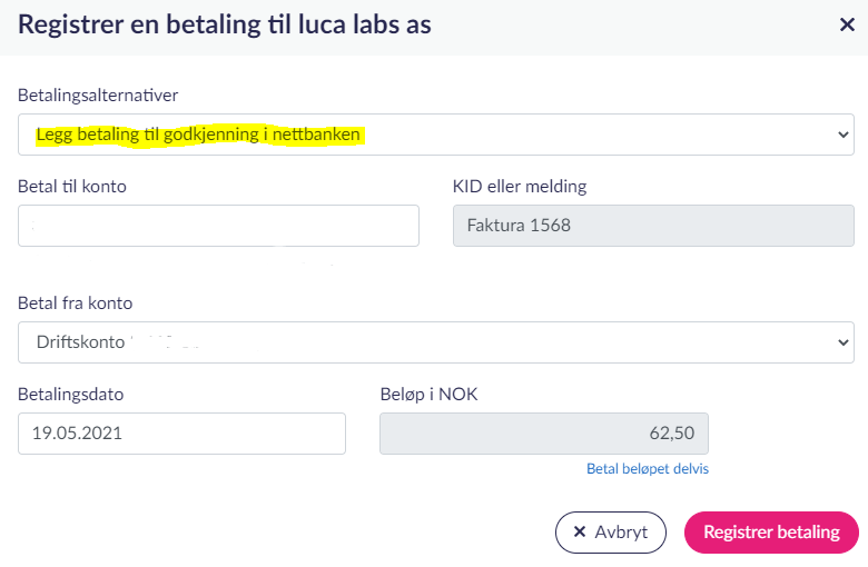 Hvis du har bankintegrasjon kan du sende betalinger fra regnskapssystemet til nettbanken. Dette skjer når du velger betalingsalternativet “legg betaling til godkjenning i nettbanken”.