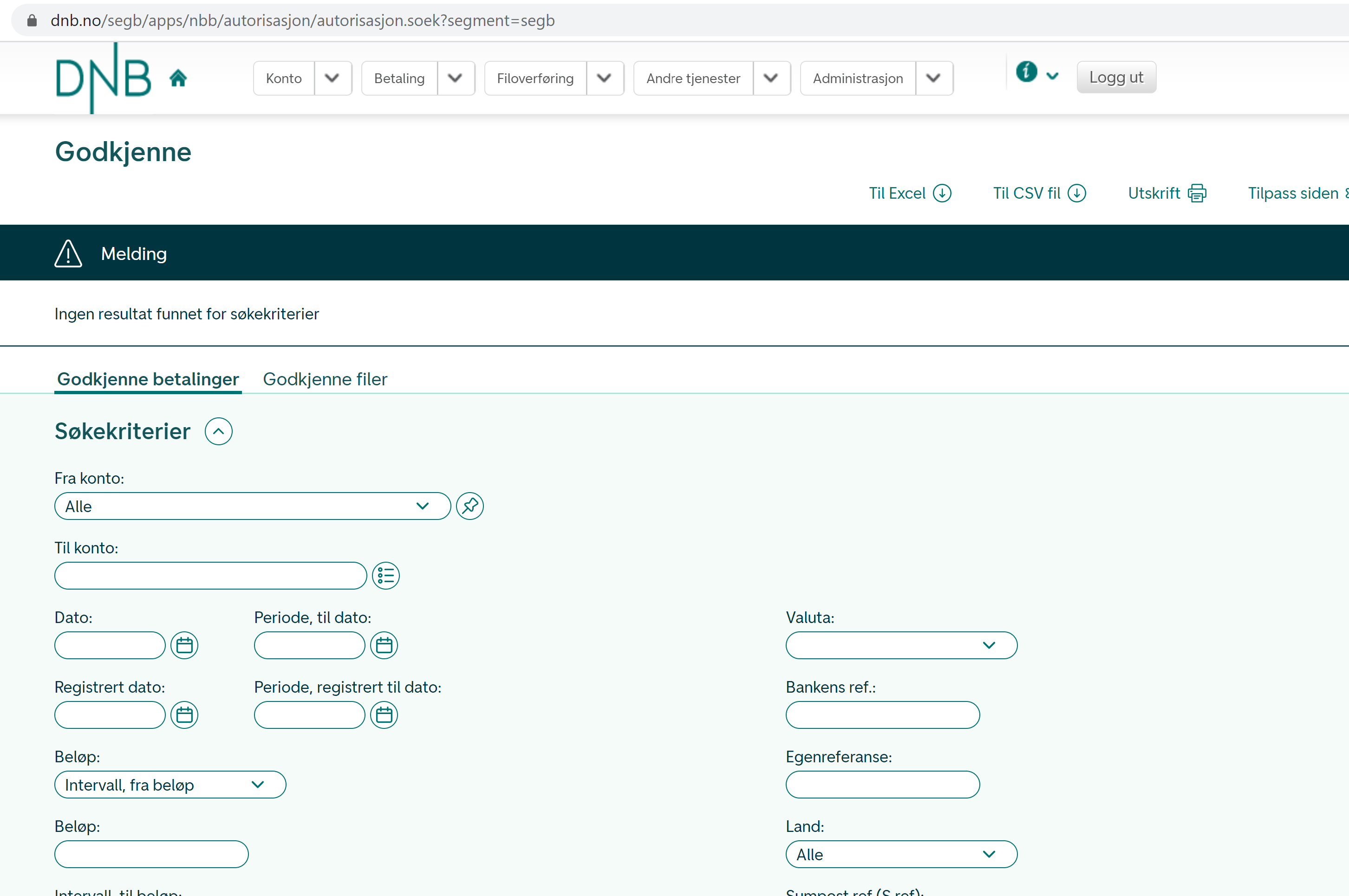 Etter at du har registrert en betaling som beskrevet ovenfor, må denne godkjennes i nettbanken.
