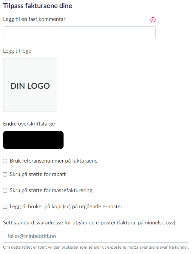 • Legg til en fast kommentar : Her kan du legge inn en kort tekst som kommer frem på alle fakturaer du sender til dine kunder.