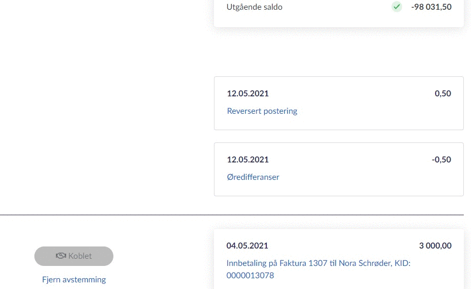 Noen ganger gjør man en feilføring, som fører til at man reverserer (annullerer) en postering. Denne hjelpeartikkelen forklarer hvordan man kobler disse sammen i bankavstemmingene.
