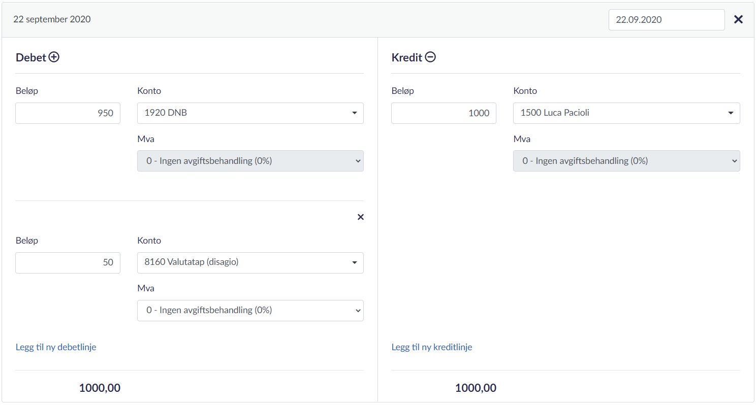 Eksempel: Kunden din betalte på forfallsdato som fører til at du får inn litt mindre penger pga vekslingskursen. Du får inn 950,00 NOK i stedet for 1000,00 NOK som det står på kundefakturaen. Da må du føre denne betalingen som et manuelt bilag og føre differansen som et valutatap.