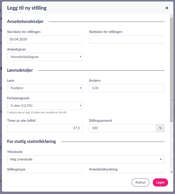 Etter at du har registrert grunnleggende informasjon som personnummer og navn, må du opprette en stilling på den ansatte.
