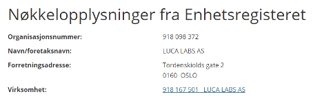 • Virksomhetsnummer : Dette er ikke det samme som organisasjonsnummeret. Du finner virksomhetsnummeret ditt i Brønnøysundregistrene ved å gå til brreg.no > søk opp selskapet ditt > klikk på «oversikt over registrerte virksomheter» > Legg inn nummeret som vises til høyre for «Virksomhet». Du kan også komme direkte til siden ved å klikke på “Finn nummeret hos Brreg”Du kan kun ha ett virksomhetsnummer per selskap.