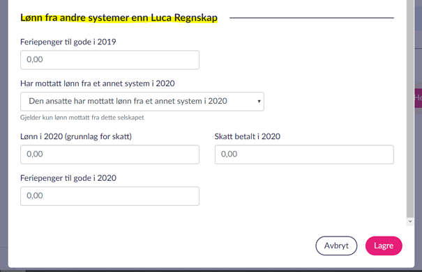 5. Under «Lønn fra andre systemer enn Luca Regnskap» så skal dette legges inn