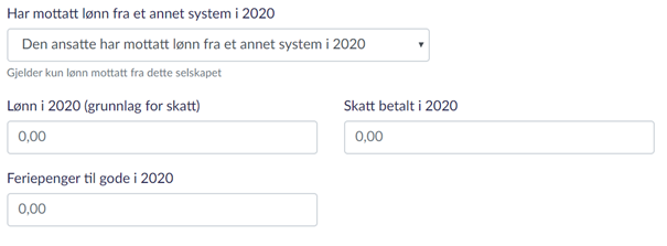 • Har mottatt lønn fra et annet system i 2020 : Her kan du enten velge «Den ansatte har ikke mottatt lønn fra et annet lønnssystem i 2020» eller «Den ansatte har mottatt lønn fra et annet system i 2020».