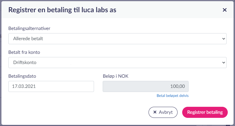Hvis du har betalt en regning fra nettbanken din (ikke gjennom bankintegrasjonen), må du huske å registrere at den er betalt også i regnskapssystemet.